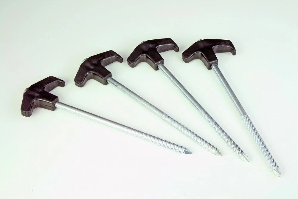 - Thick steel pegs with corkscrewed shaft for extra grip.