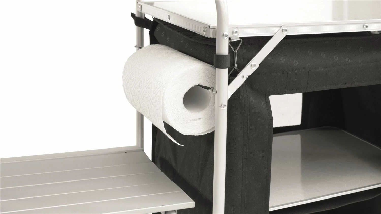 The Outwell Camrose Kitchen Table is a large stand, with storage units to each side, offering plenty of storage space and organisation. The Camrose is made from alloy, keeping the weight lower, for easier transporting to and from the campsite. The storage units also have magnetic doors, ideal for easier access into the larders, which have had an internal mesh door added for 2020. The two side tables act as great food preparation areas, and the windshield at the top protects a cooker from wind to ensure cooking is not compromised by the elements.