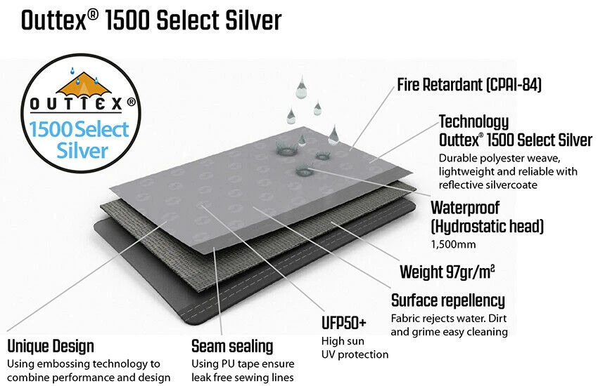 Outtex fabric in silver colour with 1500mm hydrostatic head
